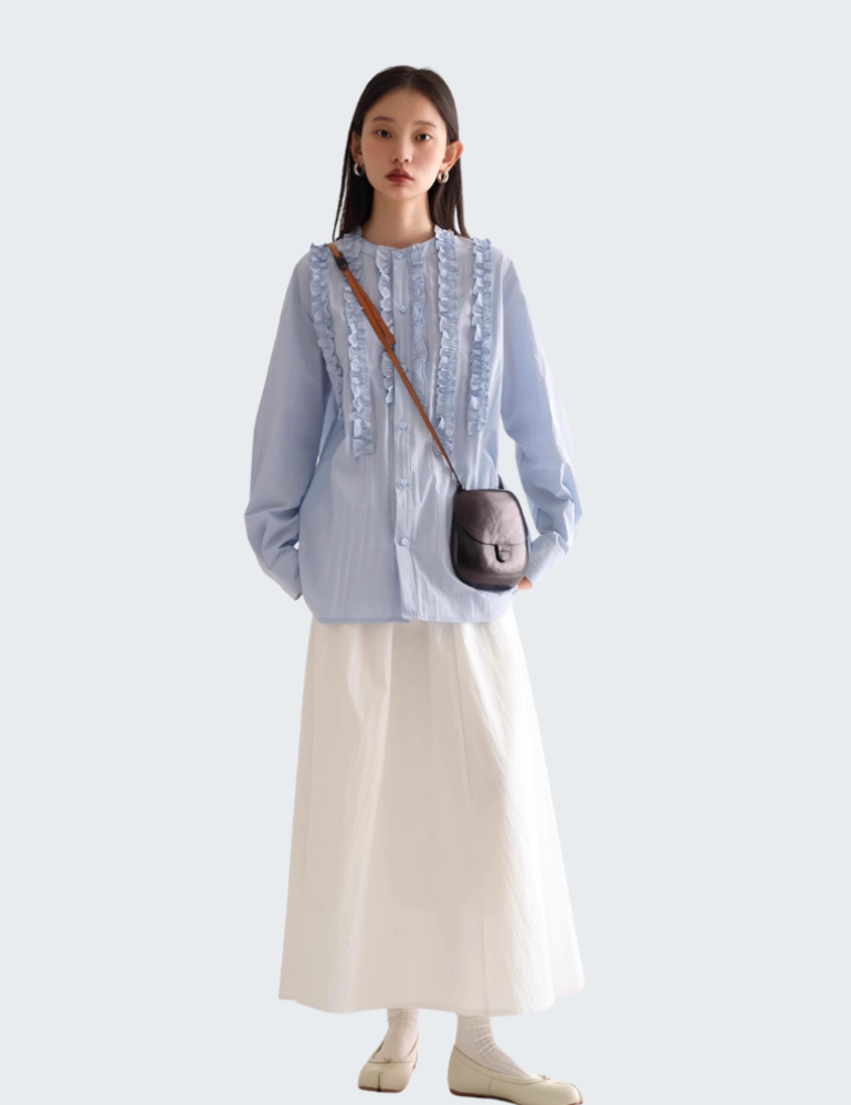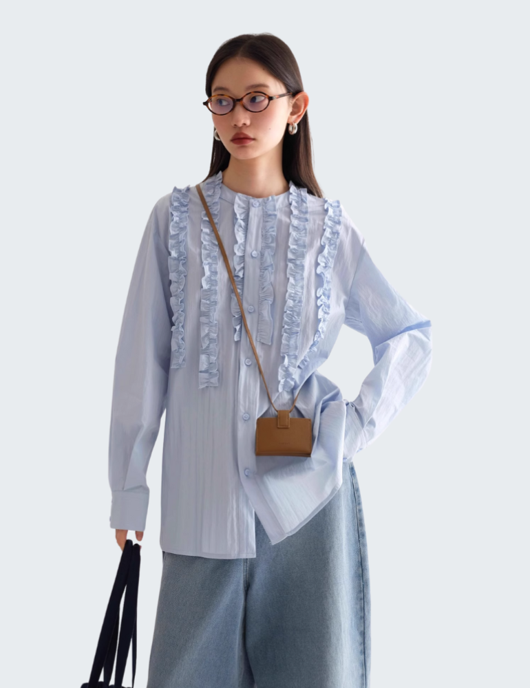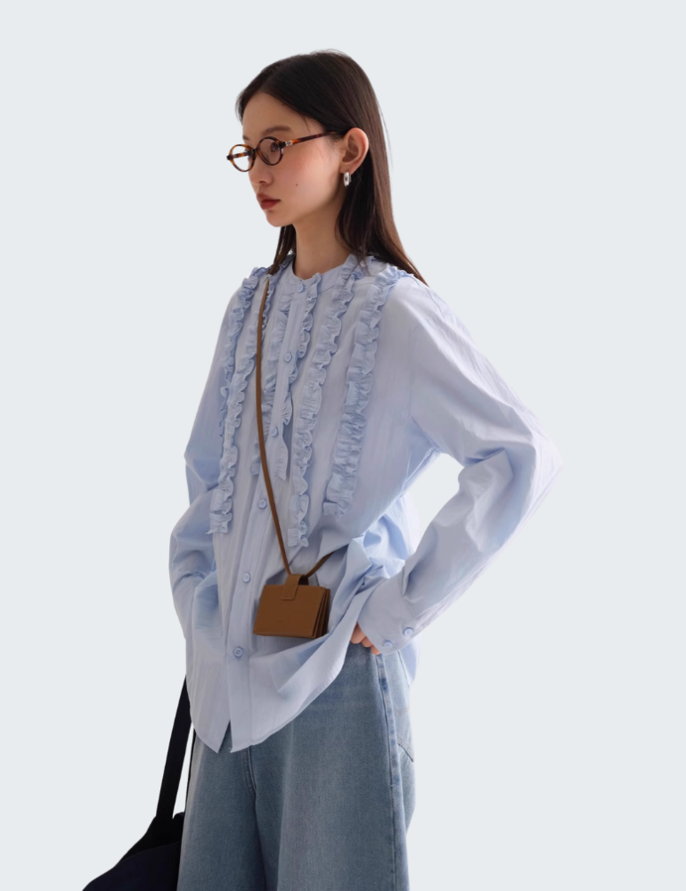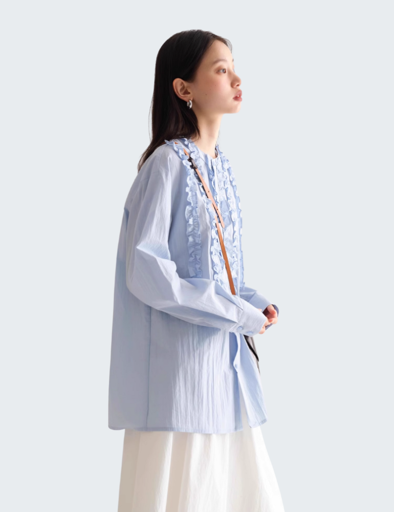 - 双层荷叶边门襟:视觉集中点设计,打破基础衬衫的单调感,增添女性柔美气质。