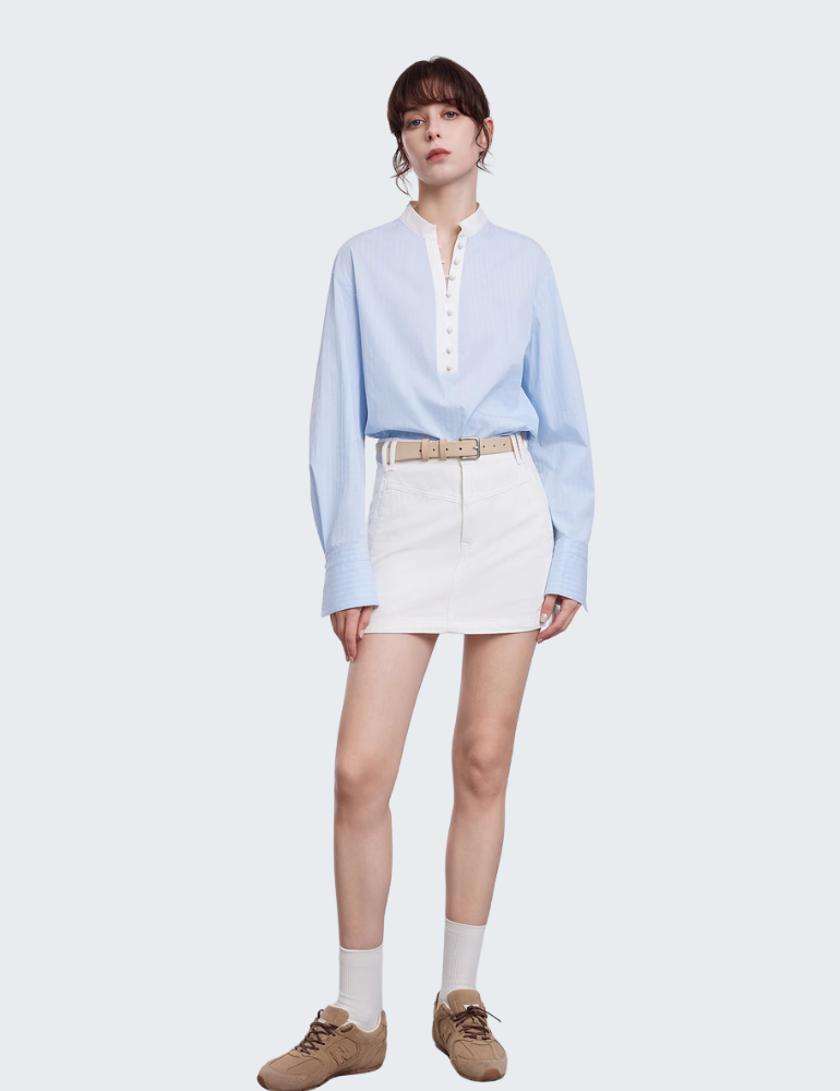- 下装:浅色A字半身裙 / 卡其色工装裙