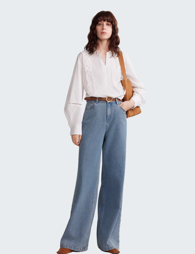 - 下装:高腰浅蓝A字牛仔裙 / 白色棉麻宽裤