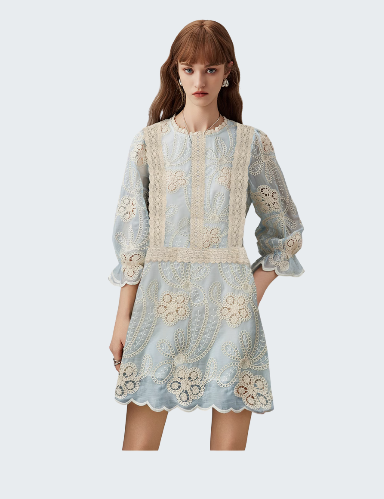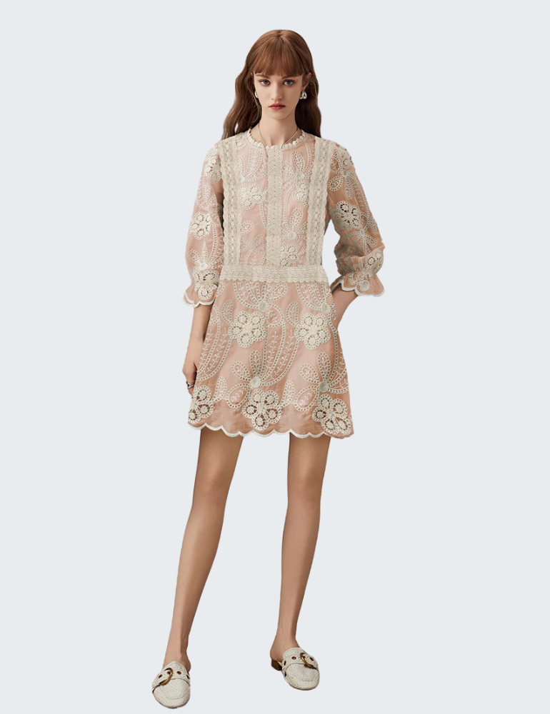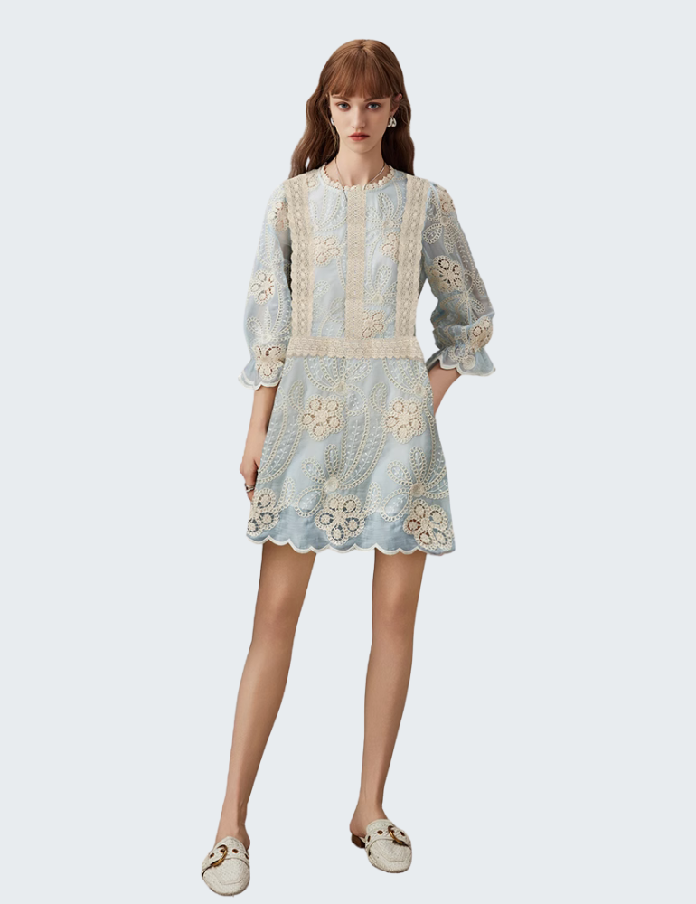 - 法式雕花蕾丝拼接:立体钩花细节贯穿裙身,层次分明,精致优雅。