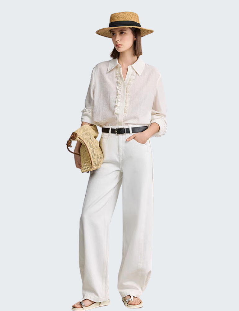 - 下装:浅蓝直筒牛仔裤 / 白色宽腿裤